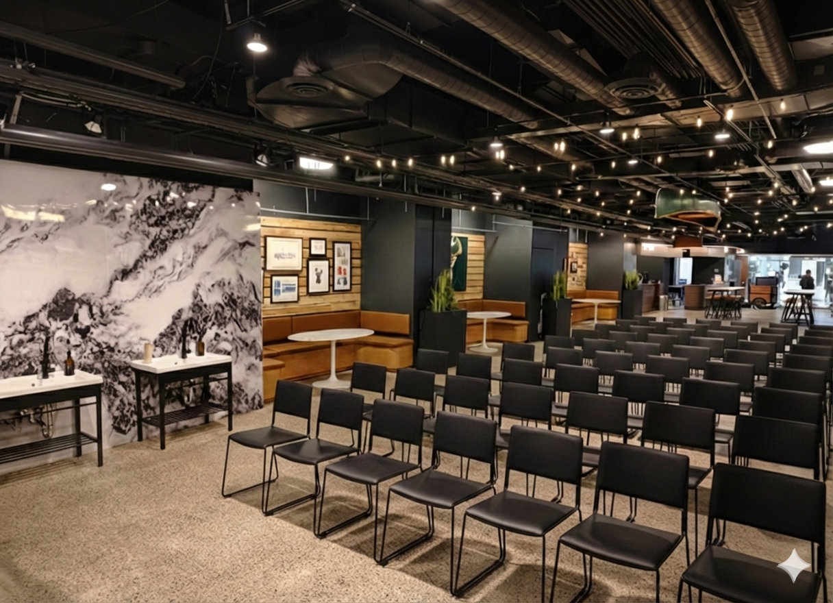 Our expansive theater-style setup accommodates up to 200 attendees, featuring a massive screen and professional lighting to ensure every presentation is impactful and engaging.